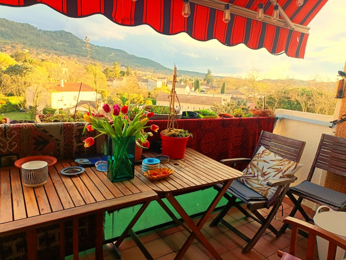 Meublé de tourisme classé 4 * : 65m2 dans écrin de verdure. La terrasse privative donne sur une forêt de chênes et de pins avec vue sur les collines. Une chambre avec un grand lit (qualité hotellerie) et une salle de bain attenante + une cuisine ouverte toute équipée et donnant sur un salon avec 2 banquettes-lits simples. Équipement complet, piscine partagée avec les propriétaires Nous serons ravis d’échanger sur les bonnes adresses de la région si les voyageurs le souhaitent.