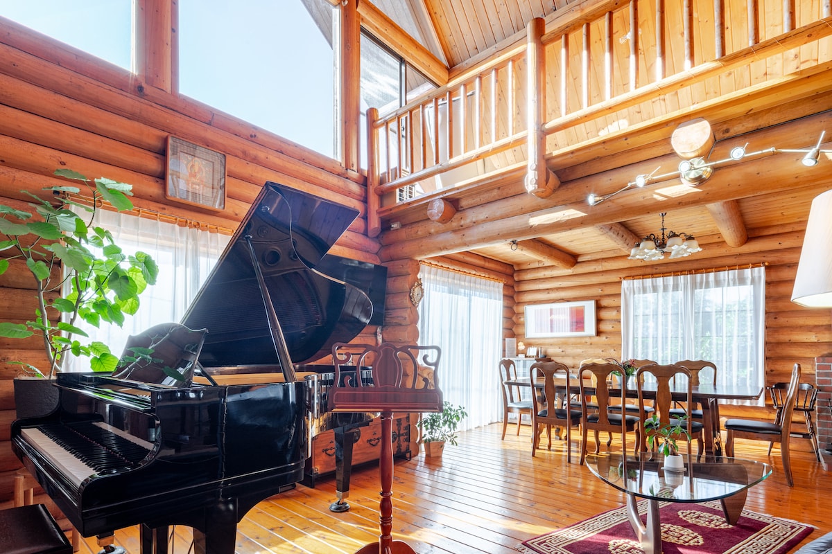 世界遺産富士山や遠くは南アルプスの山並みと駿河湾、夜は美しい街並みの夜景を眺めながら、木の温もりに包まれる。ログハウス別荘での優雅なひと時をお楽しみいただけます。グランドピアノもあり非日常な空間を演出します。ご家族やお仲間と観光名所を訪ねる旅の拠点としてもご利用ください。 This cozy log house is located in the resort area south of Hakone near the famous Hot Spring site Atami, at the entrance to Izu Peninsula. You can enjoy the beautiful views of the World Heritage site, Mt Fuji, the mountains of the Southern Alps, and Suruga Bay on the Pacific coast. It is guaranteed that you will enjoy your time- tranquility surrounded nature.