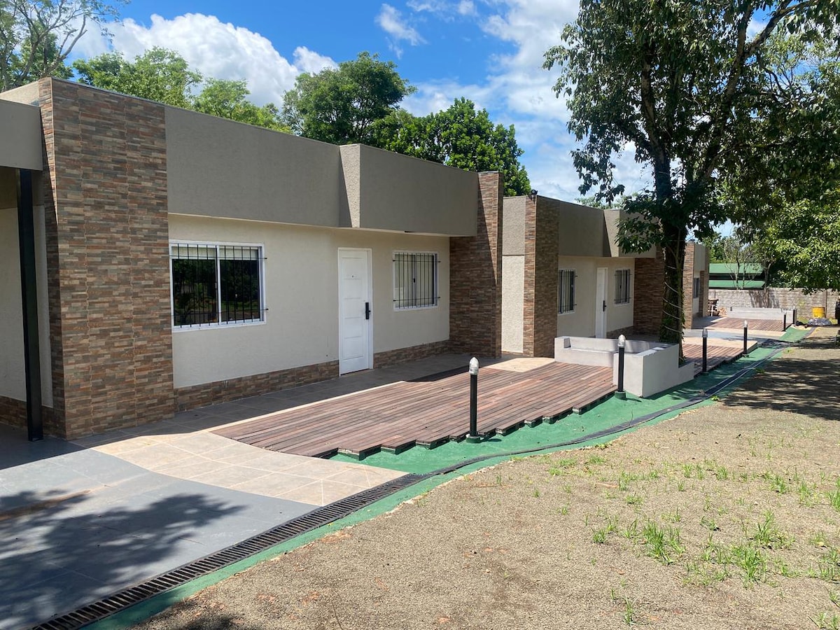 casa quincho nuevo con pileta. patio muy grande entrada y garage particular. totalmente amueblado. 2 tv led con netflix. 2 aires frio calor. agua fria y caliente. lavarropa horno heladera microondas. parrilla interna y externa. amplia galeria con hamaca. muy cerca del centro. a 4 cuadras de la costanera. y puente internacional Paraguay. dos supermercados a metros y terminal de ómnibus cerca