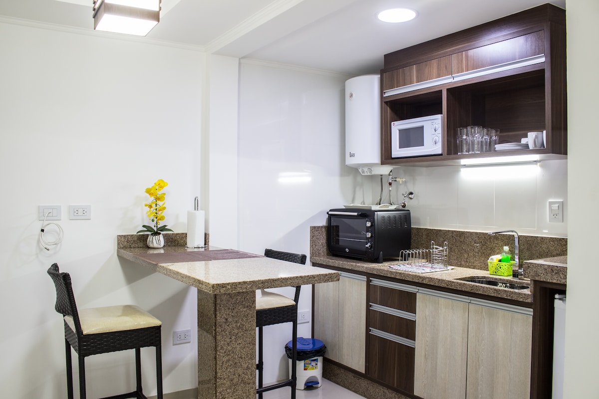 Departamento nuevo, un dormitorio cama queen size, baño con bañera, mampara blindex, piso porccelanato, cocina totalmente equipada, microondas, horno y cocina eléctrica.