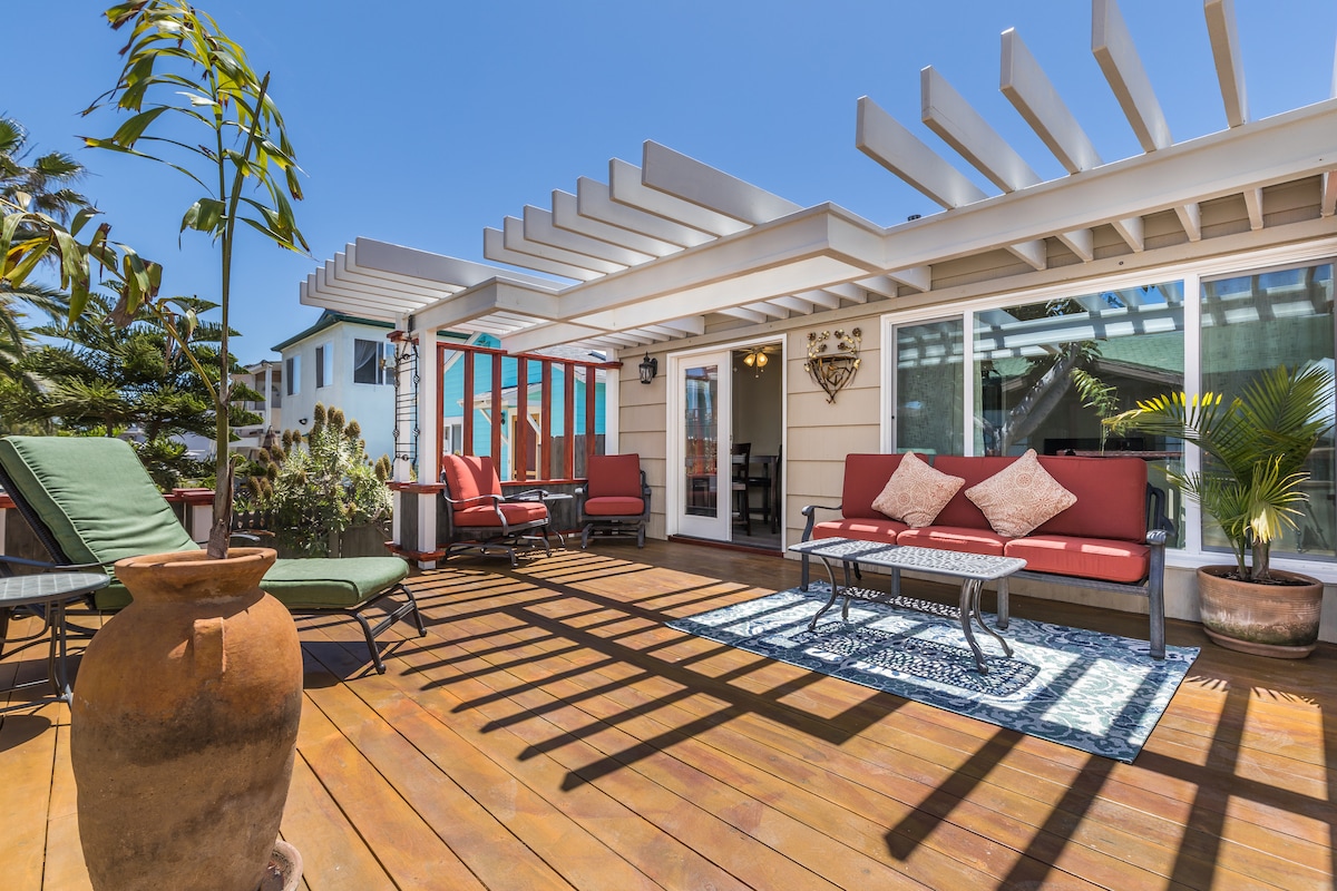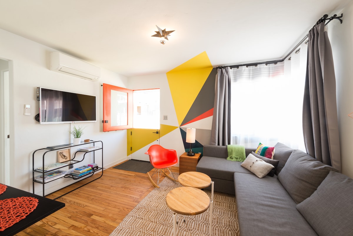 Mid-Century Modern inspired fully remodeled 1-bdrm + 1-bath beach bungalow with an additional Queen sofa pull-out bed for up to 4 people. All new interior finishes, air conditioning, heating, appliances, and furniture. Located on the nicest pedestrian-only court in Mission beach, this quiet community is occupied by long-term native SD residents. This cozy high-end contemporary home is perfect for a quiet & relaxing beach vacation. Unsafe for children (under 12), infants, or pets.