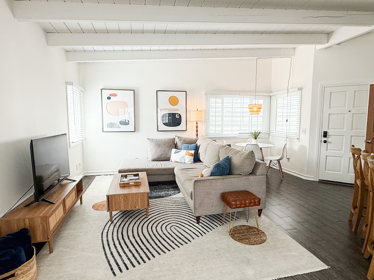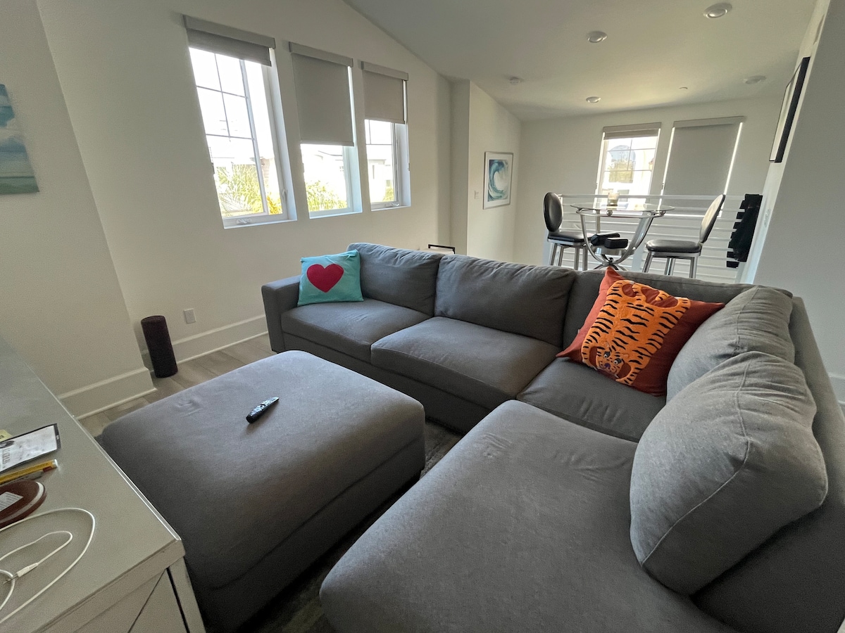 Modern Bayside Condo, 1 block from Mission Bay, Belmont Park, restaurants, rentals, & beach activities Featuring 1 bedroom with a Queen size bed, 1 bathroom, comfortable seating in the living area, fully stocked kitchen with stainless steel appliances and everything else you would need to prepare a gourmet meal + Separate dining area with adequate seating. We have a window AC in living/dining area and fan in the bedroom. There is no assigned parking.