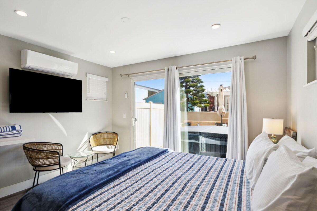 Pacific Beach Zen Villa! Located steps from the Sand and the Ocean. The patio brings a whole new meaning to the word Oasis, in which you will enjoy an outdoor fireplace and TV, outdoor shower and soaking tub and a beautiful brand new top of the line Hot Tub. All the amenities are just for your private use and the property is completely fenced for your privacy. In a peaceful street with gated parking. Inside is a Dream too! Posturepedic Luxe matress, Cheff's kitchen, rain shower, Central AC.