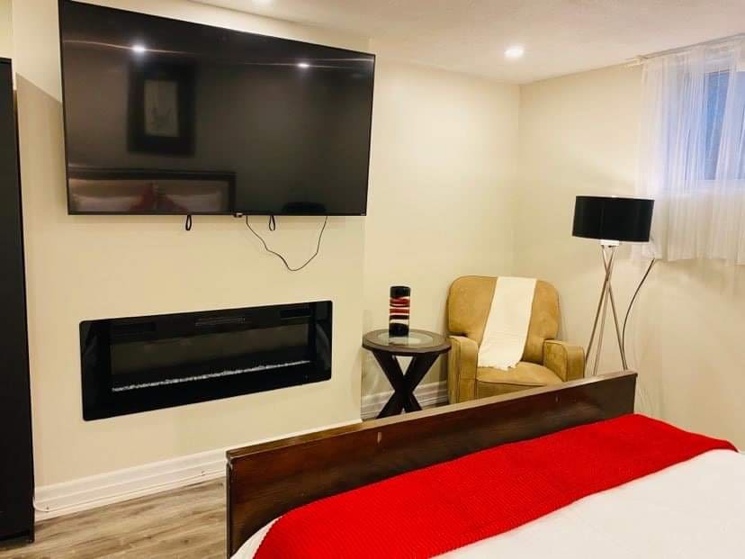 Centrally located prime location near buss, highway, parks, shopping, groceries, restaurants and movie theater. Minutes from major highway QEW, 35 min drive to Toronto and Airport. It is spacious, 2 level split apartment. Washroom and bedroom on the upper level. TV & Kitchen on the lower level. Kitchen is equipped with fridge, pots, microwave, toaster, air fryer, utensils, coffee maker. Smart TV, Netflix, Wifi, Parking, Private lawndry are all included. Not permitted: pets, smoking, parties.