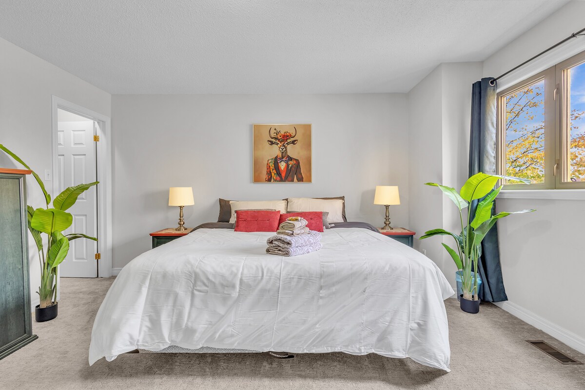 Welcome to your dream Burlington retreat! This elegant 3BR 3BA home blends modern luxury with warm, family-friendly comfort. Upstairs, the master suite features a private bath, while two bedrooms share a stylish bathroom and convenient laundry. The main floor offers a fully equipped kitchen, spacious living and dining areas, plus a work nook. Step outside to the fenced backyard with BBQ and alfresco dining. Fast Wi-Fi and parking for two complete this perfect getaway.
