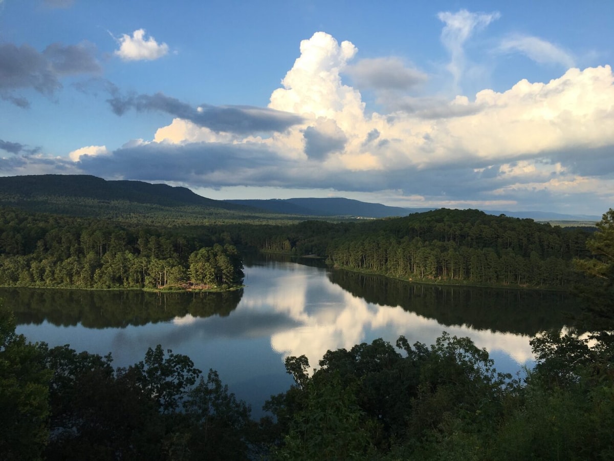 A romantic destination located in the Ozark Mountains, overlooking the White River. Roberts Belle Vue Chalet was designed for guests to enjoy a Honeymoon, Anniversary, or a quiet relaxing getaway. It is located in a semi-secluded area on top of a bluff with the scenic river valley below, and an abundance of stars above. In the Spring, Daffodils and Lavender cover the adjacent hillside. Guests can observe wildlife, Dogwood Trees, and listen to Whippoorwills in the evening.