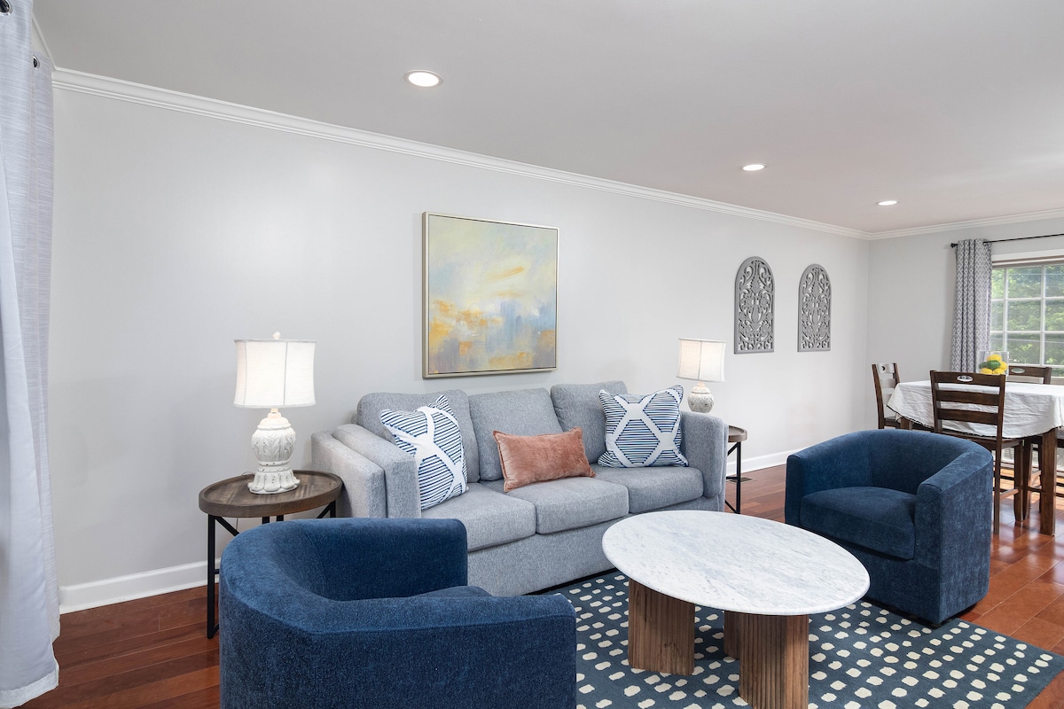 Unwind at this art-filled, newly renovated townhouse minutes from restaurants, shopping and entertainment. Two king bedrooms with smart TVs make for a great getaway for two couples or a small family. Enjoy the fully-equipped kitchen or grill on the private patio. The basement serves as a lounge and office space and is equipped with a TV, sofa, desk, laundry room and full bath. Walk to the community pool or hit the courts for a game of basketball, tennis, or pickleball with provided equipment.