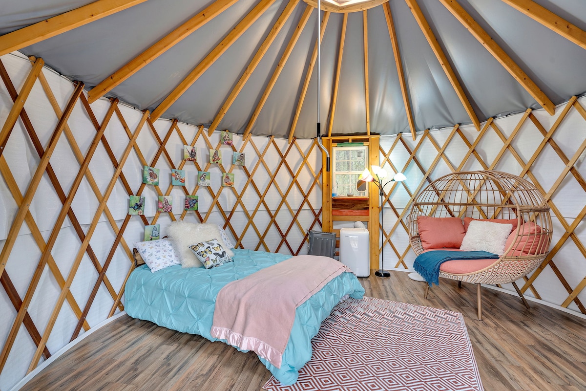 30 ft YURT with a loft and all the luxuries of a home (including HEAT and AIR)! This unique space is situated on our 50 acre farm with miles of trails and plenty of privacy. This is not your ordinary tent! This is glamping at its best with a full kitchen, regular plumbing, climate control and all the comforts of home. Keep in mind, we list this as 2 bedrooms but the 2nd bedroom is a open loft area and not private. You will love your stay in Maggie's MEGA Yurt!
