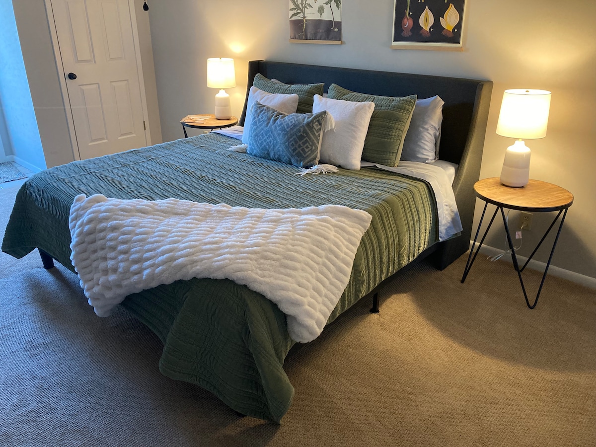GETAWAY, RETREAT, RELAX, ESCAPE-10 easy minutes to the Square & Campus, our 2/2 Barndominium is a rare experience in peaceful setting with a King en suite BR, 2nd Full BR. fully furnished kitchen, coffee/tea bar, a deep, south facing back porch has a fire pit & grill patio for your outdoors hang out. Expansive glass west end wall allows view of meadow & deer. Indoor/outdoor bar & movie/projector facilities in the east end. Staying at The Barn creates magical memories to be treasured.