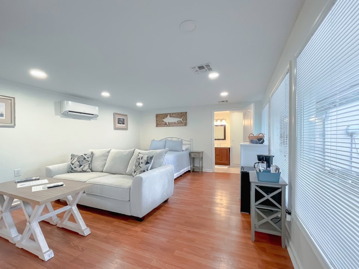 Relax and unwind in this cozy one-bedroom apartment featuring a king-size bed, a full kitchen, and a comfortable living area with a daybed and trundle for additional sleeping space. The apartment also includes a full-size bathroom with a shower and tub combo. The open layout offers the perfect place to rest, dine, and recharge. Whether you’re visiting for a quick trip or a longer stay, this apartment provides a simple, stylish, and comfortable space.