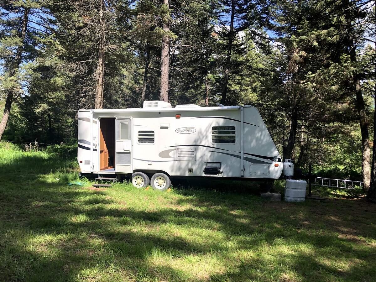 Enjoy a cozy camper in the quiet, wooded neighborhood of Evaro. Relish the tranquility of our peaceful surroundings, with Missoula just a quick 15-minute drive away. Take a leisurely stroll along the picturesque country road to reach the renowned Kampfire Steakhouse, or bring your own food and enjoy your private full kitchen with cook stove, oven, microwave, and fridge. Stay cool with AC during the day, and enjoy an evening under the stars with a campfire. Free wifi, and pets allowed!