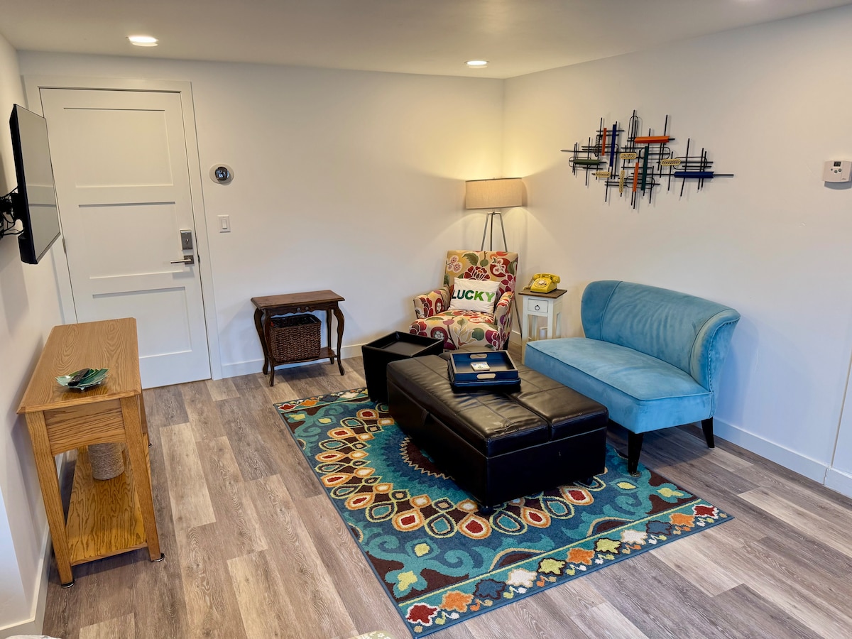 Unit includes one off street parking space in a garage and a 4th-floor patio. There are 2 mini-split AC/heating units, a washer/dryer, dishwasher, fridge w/ ice maker, a microwave, & a full stove range and a 56" tv. There is a deck w/ two recliner chairs. The bedroom includes a queen bed, a large closet & another 56" TV. There’s a 3/4 bathroom w/ tiled shower. The living room has a couch that pulls out to a king size memory foam mattress. The unit is about 2mi from campus and 1mi from downtown.