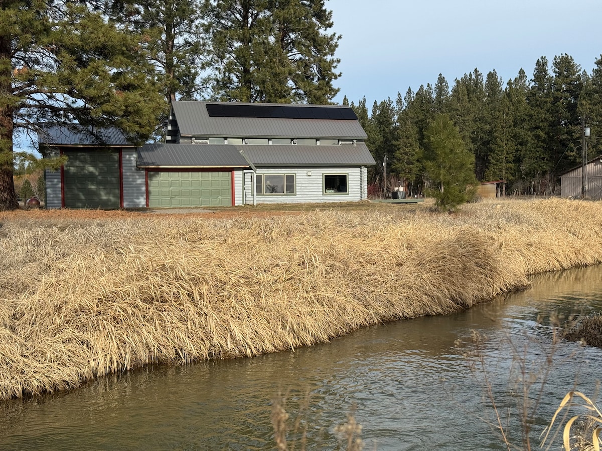 This beautiful two-story log cabin sits on 20 private acres along the banks of the Bitterroot River, just 21 miles south of Missoula. Perched on a small knoll, the cabin features a manicured lawn that leads to the river’s edge, only 100 feet away. Inside, the cabin offers a spacious living room with knotty pine cathedral ceilings, skylights, and a stunning stone fireplace framed by floor-to-ceiling windows overlooking the river. ]