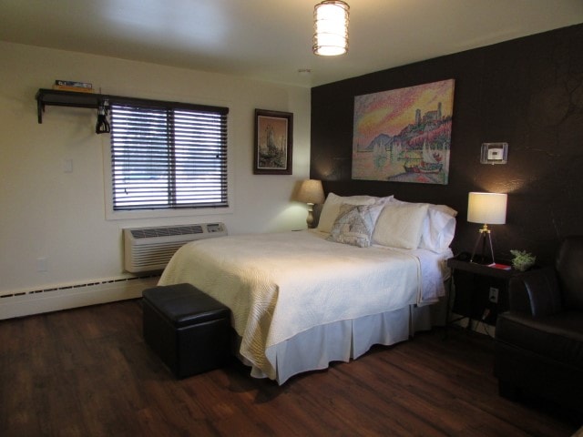 Newly renovated boutique motel room. Contemporary décor, detailed amenities and an excellent location. The unit offers a king bed, a loveseat and small dining table and stools. The unit features a kitchenette that includes some of the basics for a short stay.. Dishes, glasses, silverware, mixing/salad bowls, knives, cooking/grilling tools, coffee maker, toaster, refrigerator/freezer, microwave.