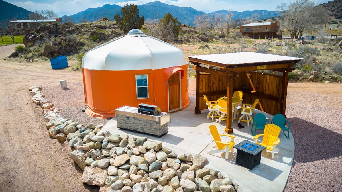 Welcome to our unique mountain retreat! This custom yurt is nestled directly between Salida and Monarch Mountain, making it a perfect base for your Colorado adventure. This 706 sq ft yurt boasts a full kitchen, bathroom with washer and dryer, and a separate bedroom under a beautiful tongue-in-groove ceiling that spirals up to reveal the dome, showcasing starry skies at night and ample natural light in the daytime. Enjoy a private outdoor space with wraparound deck & barrel sauna.