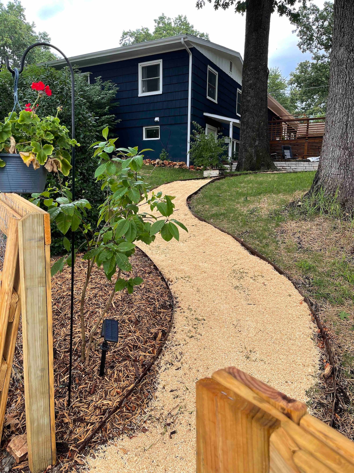 The guesthouse is attached via a breezeway to the main house. There is a covered pavilion where you can grill and eat. We have a pool that is open May-September. We have 2.5 acres mostly fenced. There is a concrete walking trail in the back yard about a 1/4 mile loop. The home is pet friendly with NO additional charge, just notify me when you book the house. We allow up to 2 pets. We ask that you keep them on a leash in the pool/courtyard area. They can run in the backyard and potty back there.