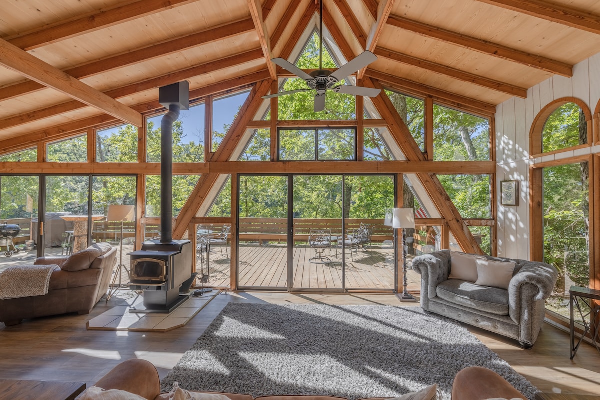 Welcome to Starlight Chalet, your dream escape nestled in the heart of Innsbrook Resort. This beautifully designed 2-bedroom, 2-bathroom chalet with a spacious loft sleeps up to 10 guests and offers the perfect blend of modern luxury and cozy charm. Step inside to find a stunning living area with a wall of oversized windows that flood the space with natural light, a wood-burning fireplace, and high-end furnishings that invite relaxation. The main living space flows effortlessly into a sleek, fully equipped kitchen and a separate dining area, making it ideal for everything from home-cooked meals to late-night board games.