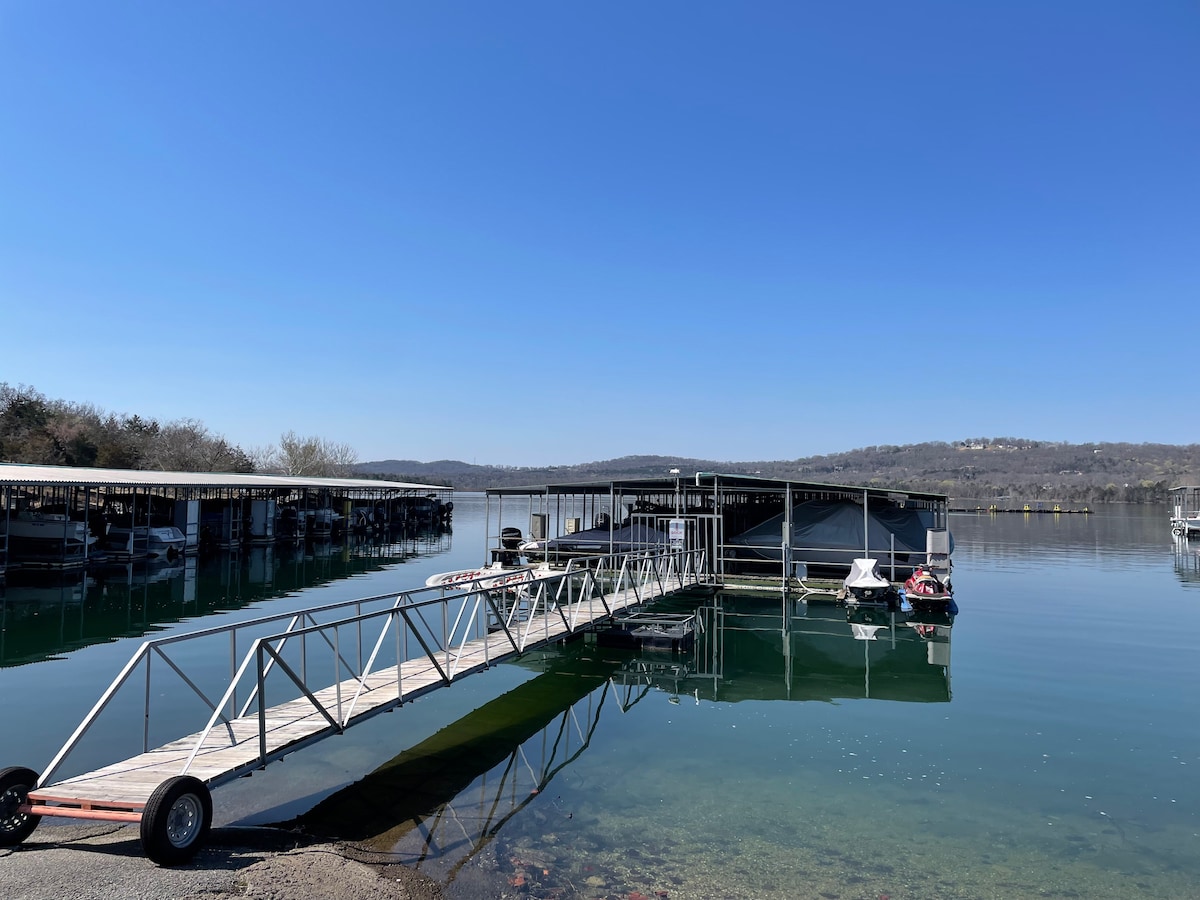 Entire lake house ready for your next lake retreat with family or friends. Spacious living area including outdoor deck space with a private dock and kayaks for use! Watch the sunset on the dock while grilling out or next to the gas fire pit. Cozy up next to the wood burning fireplace. **NEW LOWE Tritoon BOAT RENTAL option or space to side dock your boat. Close to the strip, grocery stores, and restaurants. Mini golf, go-karts, and a winery are also nearby. Perfect for a weekend or long get away.
