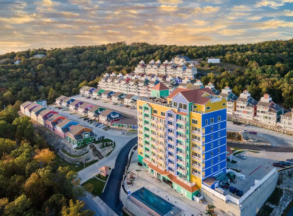 Located in peaceful Branson Canyon. The only 8 bed 6 bath in the community. Sleeps 24 comfortably. The lodge has lower level rec room with a Theater, pool table, private hot tub to use rain or shine on lower level patio along with a firepit! The home backs up to woods with a nature trail and creek.