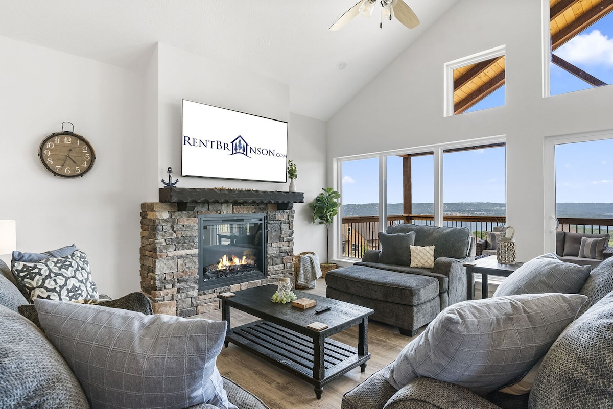Your Table Rock Lake escape awaits! Big Bear Cabin is a 7-bedroom, 4-bath lakeside retreat that sleeps up to 19 guests. With 3,470 sq. ft., two kitchens, two living rooms, and an open floor plan, it’s perfect for family reunions and group getaways. Enjoy a private hot tub, golf cart access to resort amenities such as seasonal saltwater pools, splash pad, swim dock, pavilion, sports court, playground, and shoreline fishing and swimming. Unit includes a fully appointed kitchen and pet-friendly acc