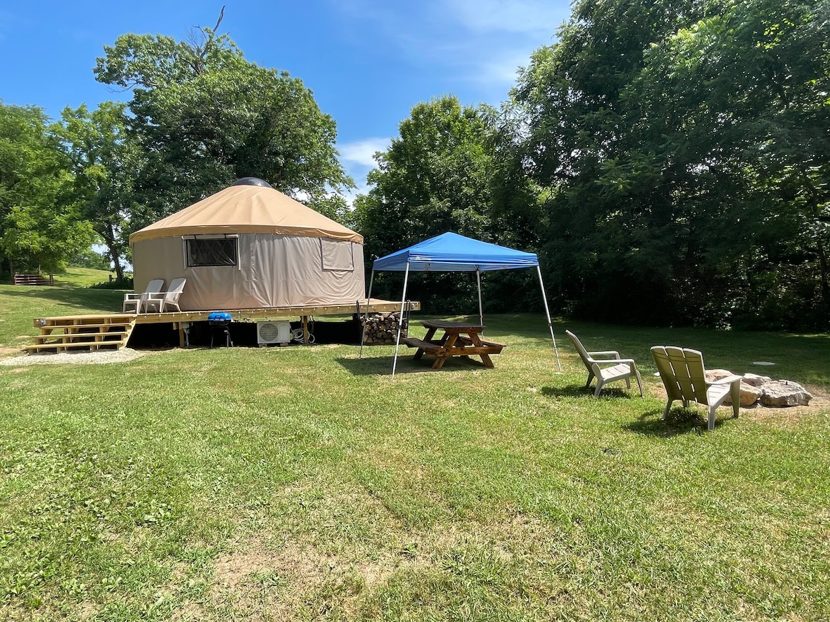 16 ft YURT with all the luxuries of a home (including HEAT and AIR)! This unique space is situated on our 50 acre farm with miles of trails and plenty of privacy. This is not your ordinary tent! This is glamping at its best with a mini fridge, microwave and Keurig, regular plumbing, climate control and all the comforts of home. You will love your stay in Maggie's MINI Yurt!