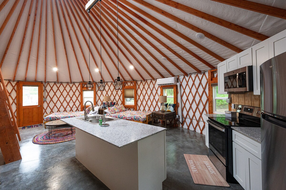 30 ft YURT with a loft and all the luxuries of a home (including HEAT and AIR)! This unique space is situated on our 50 acre farm with miles of trails and plenty of privacy. This is not your ordinary tent! This is glamping at its best with a full kitchen, regular plumbing, climate control and all the comforts of home. Keep in mind, we list this as 2 bedrooms but the 2nd bedroom is a open loft area and not private. You will love your stay in Maggie's MEGA Yurt!