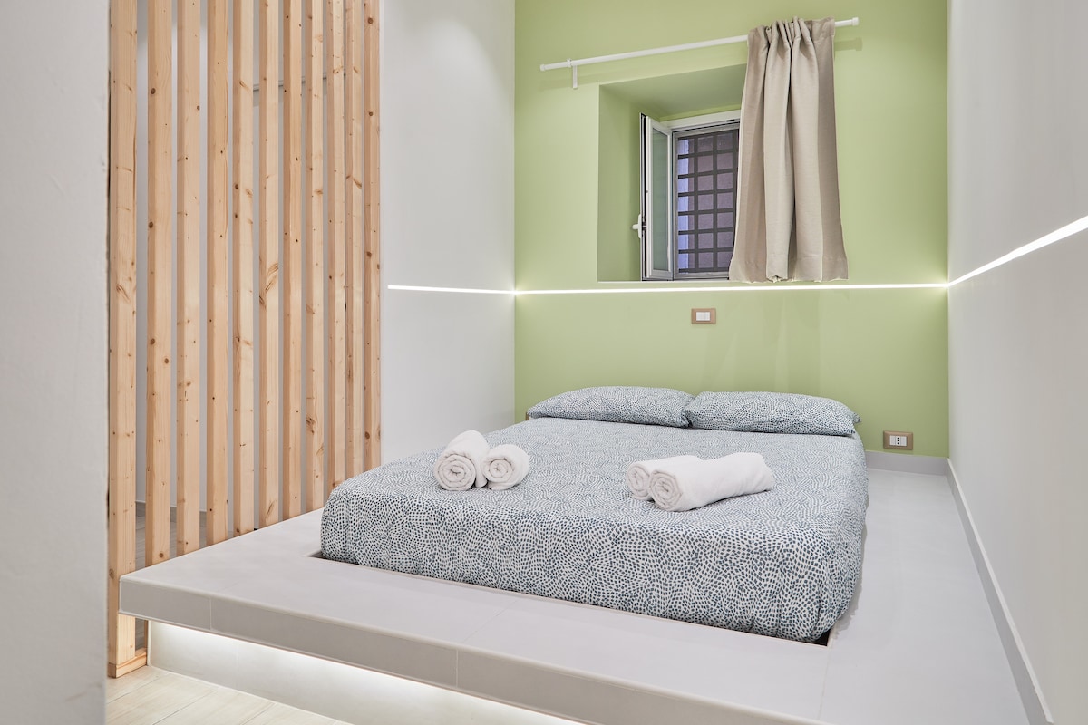 Cozy apartment in the heart of Catania. Located beside the iconic Via Etnea, walking distance to magnificent Duomo, in an early XX century building this three floor apartment is composed of two spacious bedroom, a full equipped kitchen and a roof terrace. Each bedroom, one per floor, has a double bed, bed-sofa, wardrobe and two balconies. Equipped with Smart tv, air conditioning and Wifi, the room boasts an en suite bathroom complete with a shower, hair dryer and complimentary hospitality set