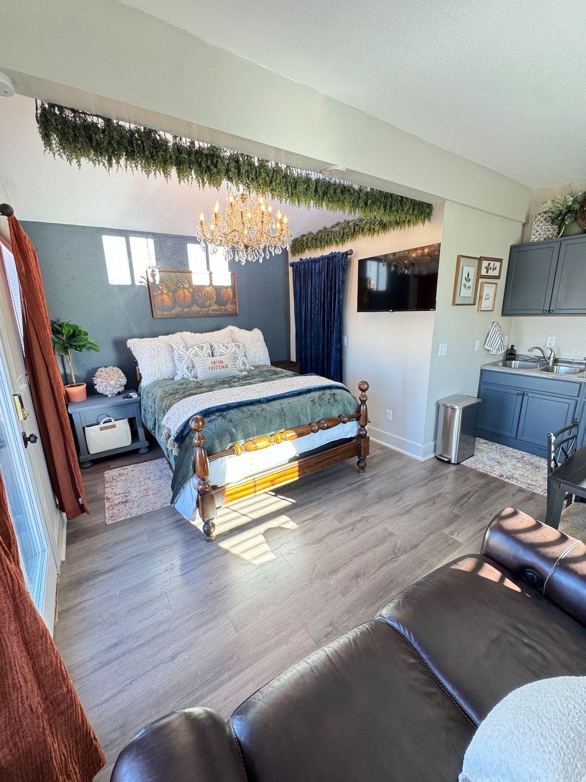 Cozy 1 Bedroom Guest Cottage in the heart of Colorado City, Tx. Recently updated and nicely furnished with quality furniture. and luxury linens and pillows. Large Kitchen with full size Refrigerator and Sit-Up Island, and an oversized Bedroom with beautiful furniture and KING BED, 2 large closets, large TV's. Quality Queen Air Mattress for extra guests. The Cotton Mill features a tucked away location, private yard space, and shared laundry facilities with The Cotton Gin. FREE 24/7 GYM ACCESS!
