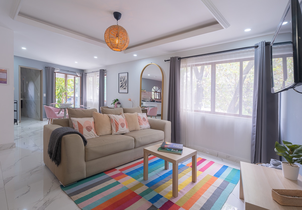 Ground floor apartment with patio, all amenities. 2 bedrooms: -One with a king size bed -The other one with a queen bed - A sofa bed. Perfect for business or family trips. Excellent location, quiet and safe area, close to the Insurgentes theater, Plaza Manacar