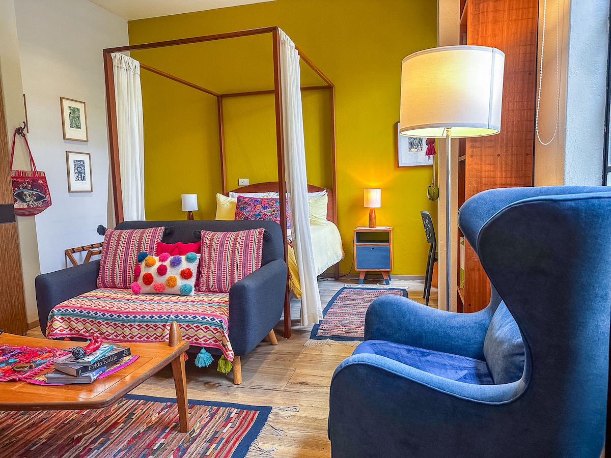 Welcome to La Palma, a 280 sq (26 m²) suite that is part of the seven suites in the iconic El Guajolote de Coyoacan. 📍 Just steps away from the Frida Kahlo House and Coyoacán Plaza. 🔐 Private spaces: kitchen, private bathroom, and a cozy sitting area. 🛏️ Queen Size bed. ✍️ Ideal for couples, writers, or nomads. 🌿 Enjoy the tranquility and authenticity of the neighborhood.