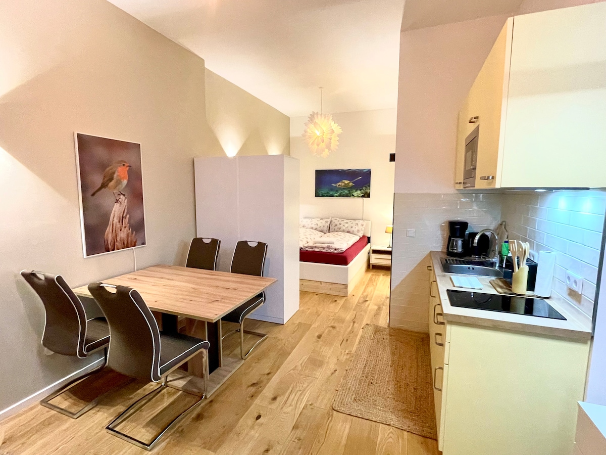Hier erwartet Dich ein Mini- Apartment (18qm) mit allem was man für einen Aufenthalt von ein paar Tagen braucht. Bett, Küche und Dusche sind offen gestaltet und sorgen dafür, daß man sich nicht eingeengt fühlt, trotz der wenigen Quadratmeter. Das WC hat eine eigene Türe. Gelegen im 4. Stock eines sanierten Altbaus in der beliebten Winsstraße, eigener Eingang und Aussicht nach hinten ins Grüne (kein Aufzug). Auch wir wohnen in dem Haus und helfen gerne bei Fragen oder mit Tipps.