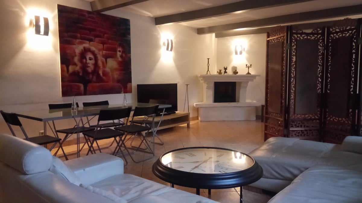 Originally designed and planned as a showroom / meeting room . The idea was to built a place to discuss, meet and represent. Reason for the location which is great to reach anything in this fast growing City of Berlin. The space and atmosphere have a happy synergy and a work / life balance for itself. I love it here - it is usually my office . We have 2 big flat screen TV screens with Amazon Prime, Netflix a sound system with Spotify and an open fire place to calm down.