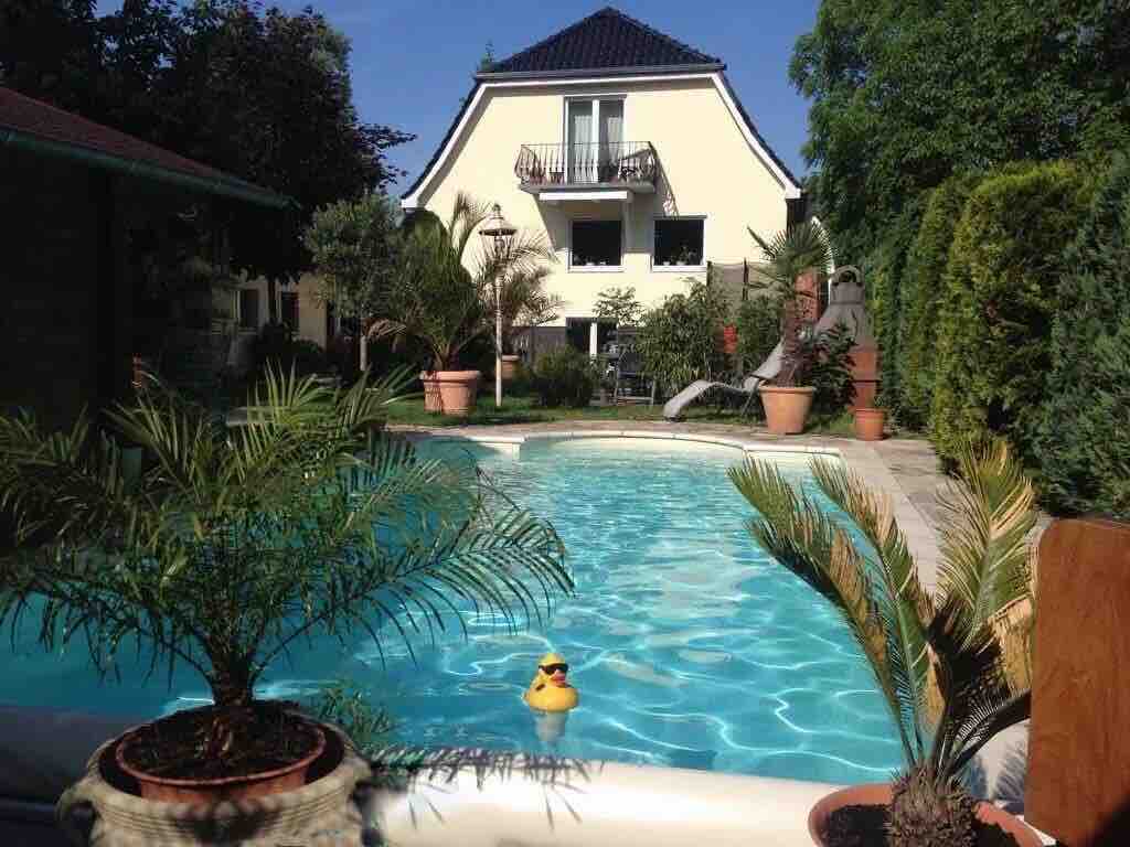 - High-quality furnished, self-contained, well-kept 2-room apartment in a 320sqm single-family house - Use of the indoor pool and sauna included - direct bus connection from the new airport BER (30 min) - 25 minutes by car from the city center (35-40 min by public transport) - within walking distance from the Berlin Wall Trail at the city limits - 1 small room with king size double bed, 1 large room with 2 double sofa beds - Legal and registered Berlin holiday home (RNr.: 08/Z/AZ/007123-18)