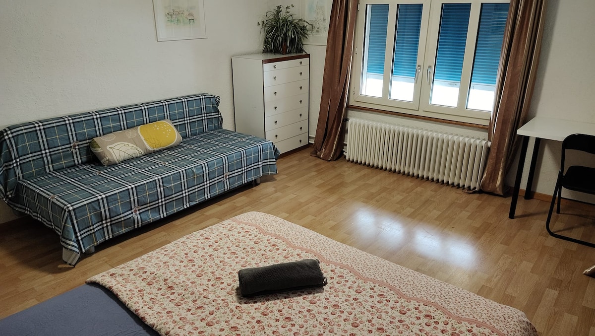Spacious 4-room furnished flat in St. Gallen City. The flat offers 4 bedrooms (2 single bedrooms, 2 large bedsrooms), 1 kitchen and 1 bathroom. There is no living room and the kitchen is rather small, so it doesn't offer enough space for all guests to sit down together.