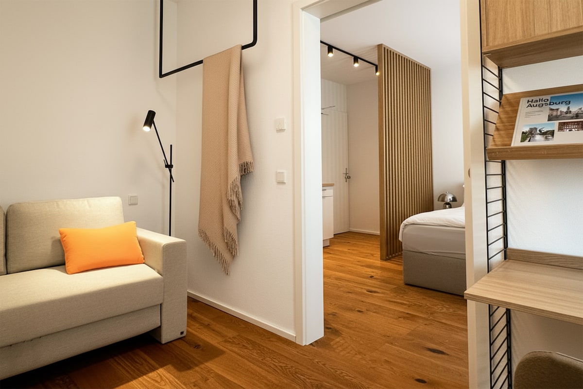 Die Unterkunft verfügt über ein Schlafzimmer sowie einen abgetrennten Wohnbereich mit zusätzlichem Schlafplatz und Arbeitsplatz – ideal für Paare, Familien mit zwei Kindern oder zwei Erwachsene, die lieber in getrennten Zimmern übernachten möchten. Erlebe Augsburg direkt vor der Tür: Der Rathausplatz liegt unmittelbar vor dem Apartment. Cafés, Restaurants, Straßenmusik und Sehenswürdigkeiten machen den Aufenthalt zu einem echten Städtetrip-Erlebnis.