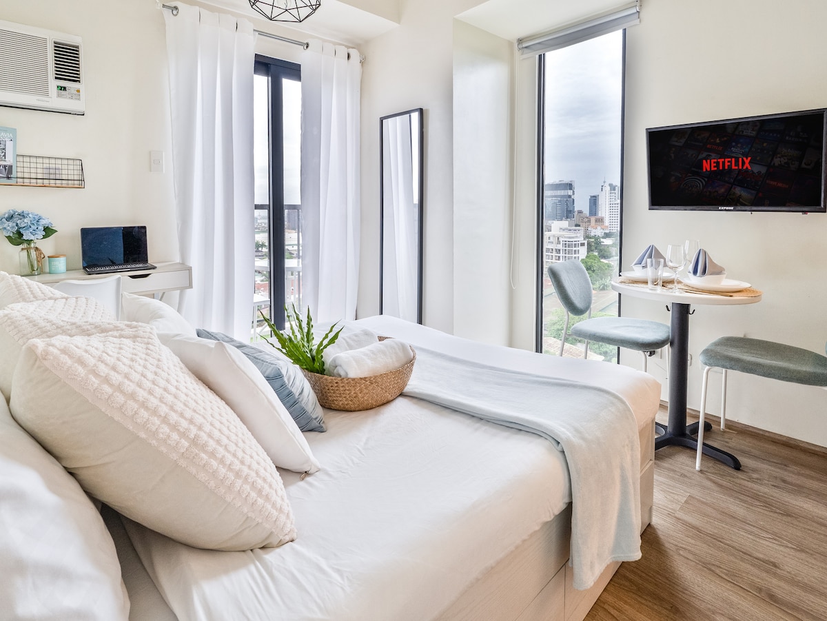 Enjoy a peaceful stay at this minimalist studio. Perfect for solo travelers, couples, or business guests, this space offers comfort, convenience, and a serene atmosphere. 🛏️ Inside the Unit: ✅ Spacious queen-size bed ✅ Fast Wi-Fi ✅ Smart TV with Netflix ✅ Kitchen equipped for light cooking 🏡 Amenities: ✅Two Swimming Pools ✅ Fully-equipped Gym ✅ 24/7 Reception, clubhouse, kiddie playground, open chapel, roof deck, and jogging grounds 🛒 Just Outside the Property: 7-Eleven, laundry, and spa