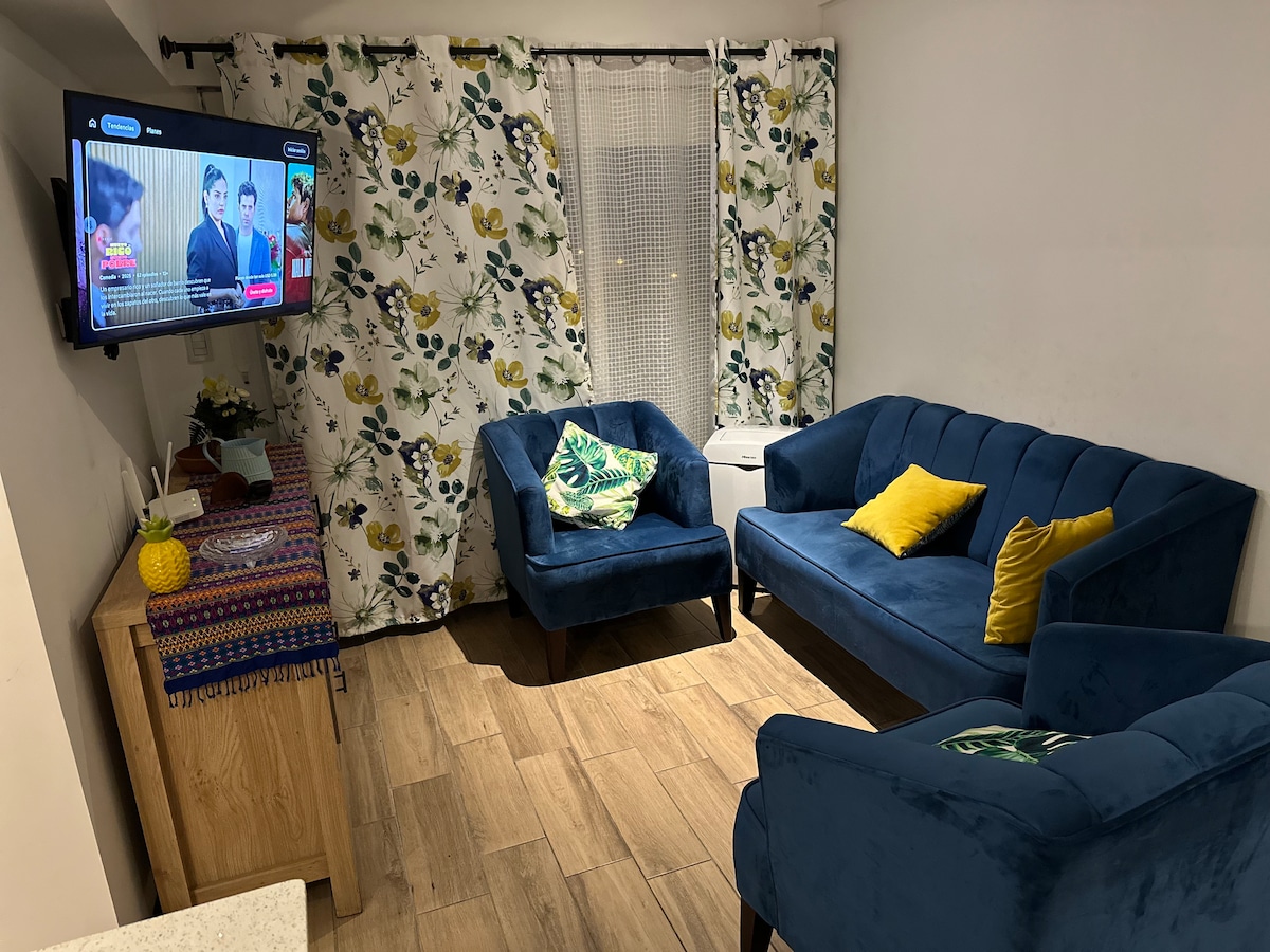 Apartamento entero tipo Loft. Cuenta con una hermosa terraza, 1 dormitorio abierto con cama Queen y A/C, baño privado , sala, comedor y cocineta totalmente equipada, lavadora y secadora de ropa. Con smart TV de 58" para entretenimiento y wifi. Incluye 1 parqueo gratuito en las instalaciones.