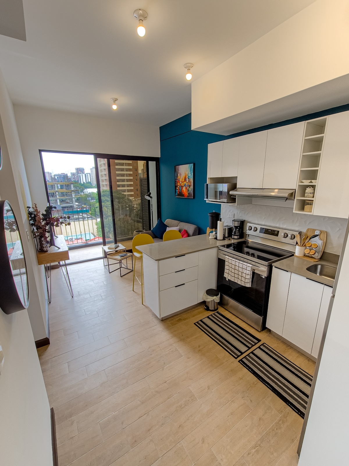 Feel the experience of staying in a brand new loft apartment in the beautiful country of Guatemala. Our apartment with modern, elegant touches that accompany an unparalleled view, provide calm and tranquility in one of the most exclusive areas of our country. You will have the opportunity to stay near shopping centers, restaurants, the hotel zone and a few minutes from the international airport.
