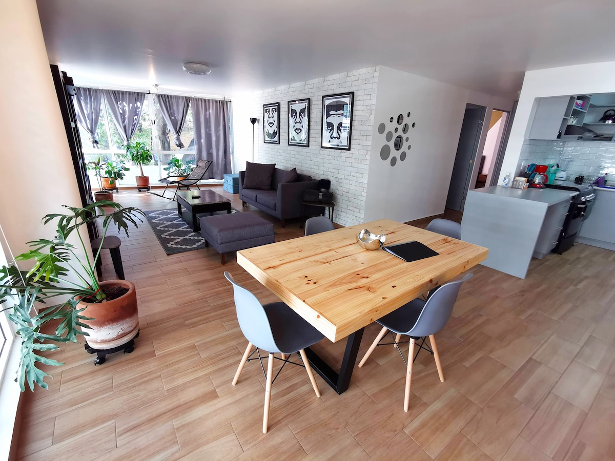 Vive como en casa, depa acogedor, cómodo, con todos los servicios y excelente ubicación. Ambos cuartos tienen cortinas Black out para que puedan descansar. La zona es muy segura y tranquila para caminar. Tendrás a cuadras el bonito Parque Hundido, en donde hay varias cafeterías y restaurantes para comer( Tacos, tortas, sushi, etc)