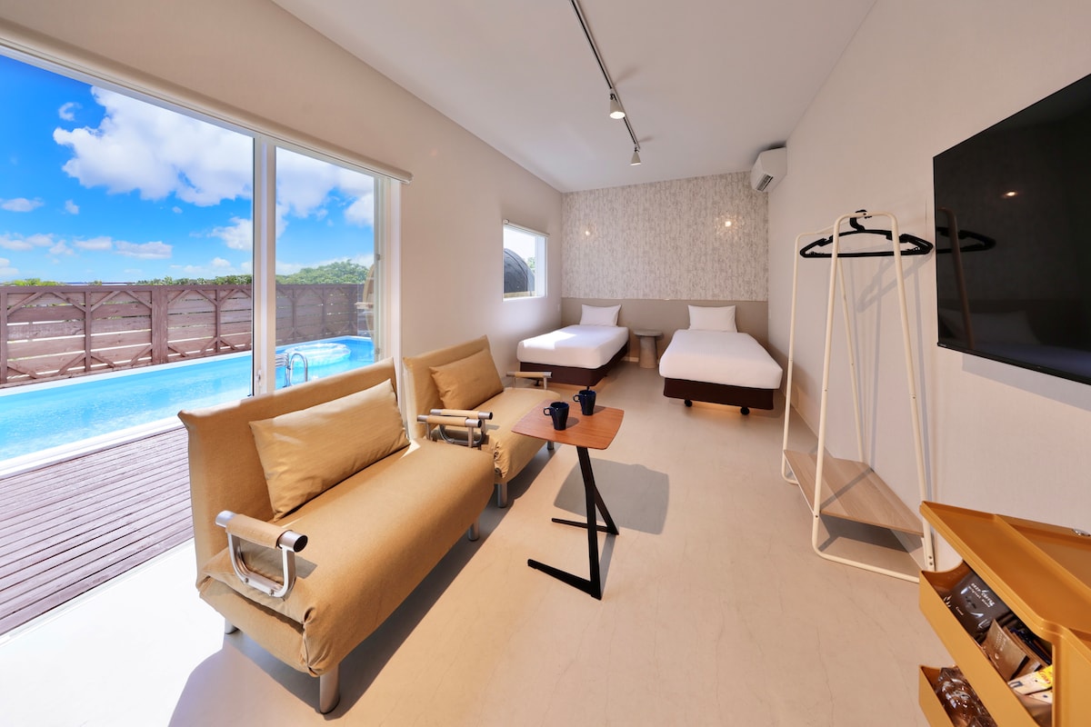 Family and group can enjoy at ease You can enjoy Ikema Blue, the bluest color of Miyakojima Accommodation near Yabiji, one of the largest coral reefs in Japan! You can watch Netflix on the living room TV Enriched amenities that are eco-friendly and use local natural materials Be sure to wear a swimsuit when using the jacuzzi. The rooftop is slippery. For BBQ, please check the message after booking. Two complimentary rental bicycles are available at the entrance.