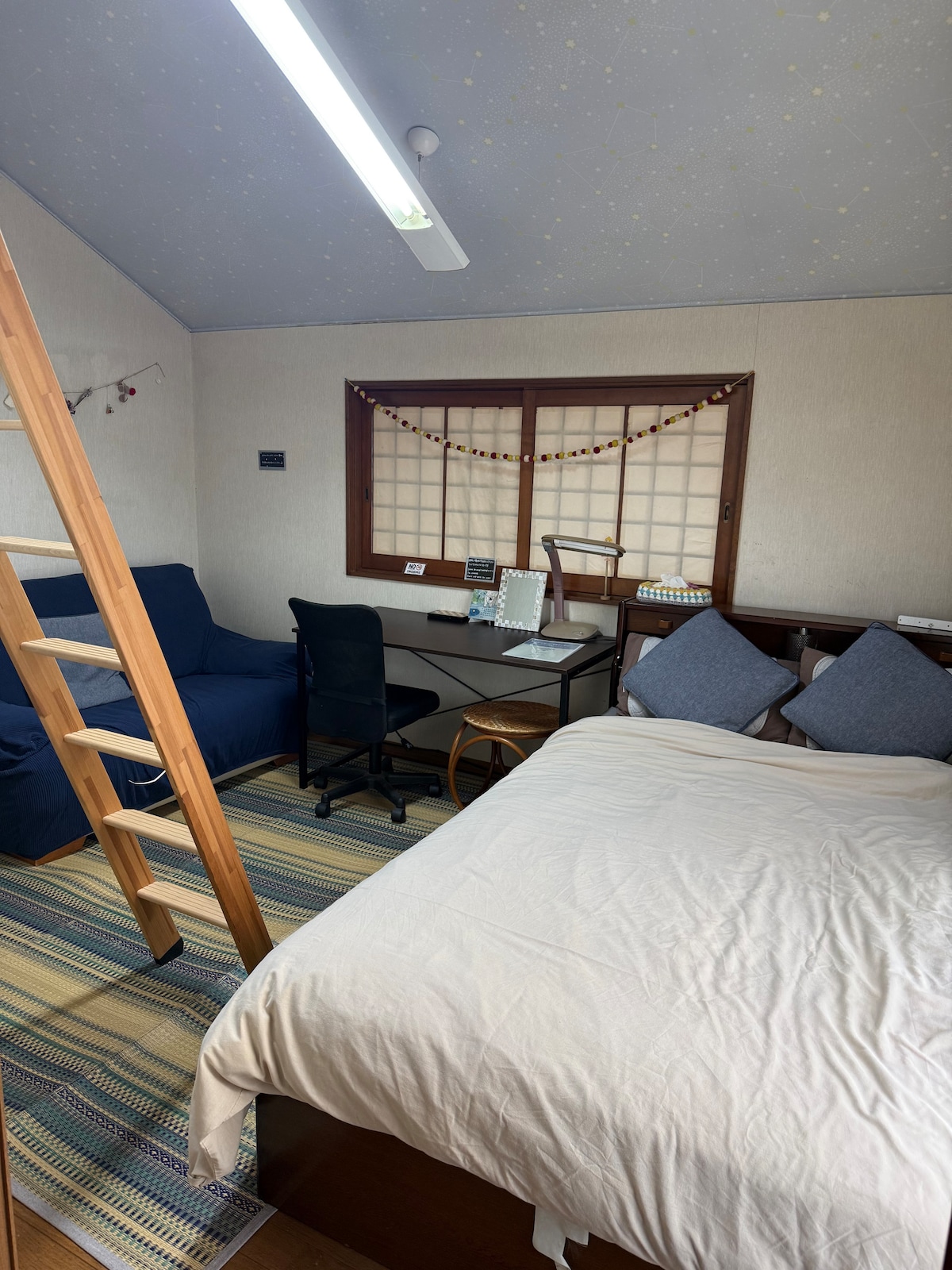 こちらのお部屋は、アパートの二階にある、1室2LDKのお部屋です。建物は築30年経ってます。 お風呂、トイレは別々になります。トイレはタンク式で、連続して水を流す事は出来ません。水がタンクに溜まりましたら、流す事が出来ます。 ベットは、シモンズ製のベットとソファベッド、お布団が3組ございます。基本的な寝具のセットは、ベッドを優先してセッティングをします。ご要望が有る場合には、事前にメッセージをください。 キッチンはお料理出来るようにお鍋やフライパンなども準備しています。 バスタオル、タオル、シャンプー、リンス、洗濯洗剤などのアメニティもございます。歯ブラシは環境保護の為に、置いてません。ご持参ください。