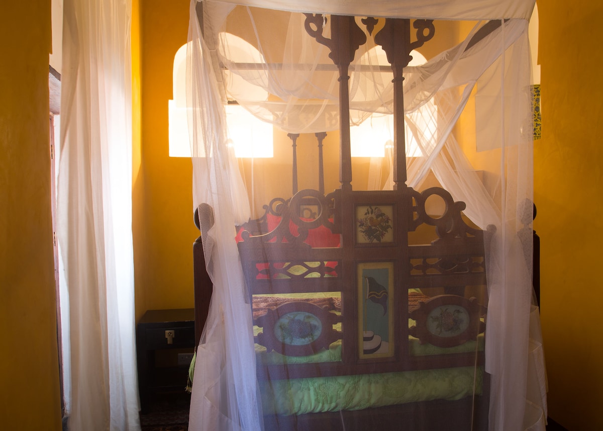 Traditional Swahili single bed (4x6), antic furniture, air-con, ceiling fan, private bathroom with bath tub combined with shower, mosquito net, safe, high speed wireless internet access... Views on the old town