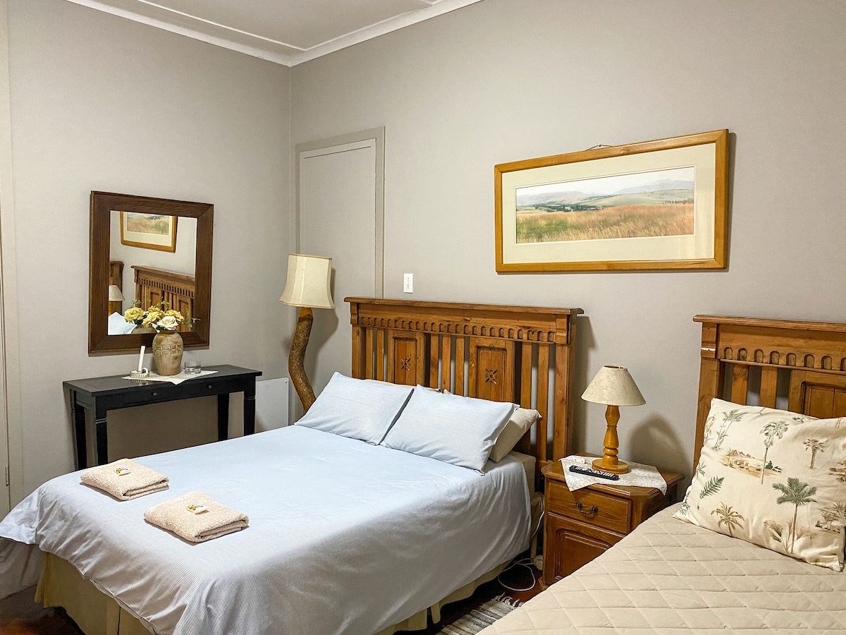 This air-conditioned room sleeps 3 people and offers a queen-size and twin bed and an en-suite bathroom with a shower. It features a TV with DStv, free Wi-Fi, an air-fryer, a microwave, a fridge, tea and coffee-making facilities, and a ceiling fan.