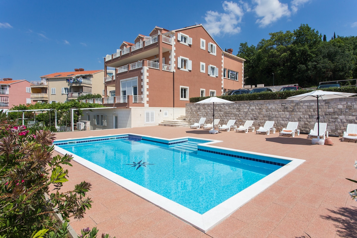 Fully renovated in 2016 for your pleasant and comfortable stay. The apartment comes with free parking spot, swimming pool, free wi-fi and satellite TV. Our guests also have access to a private terrace with a beautiful view on the Adriatic sea. For more information see detailed description. I also have 5 more apartments in this villa listed on AirBnB (see my profile for links)