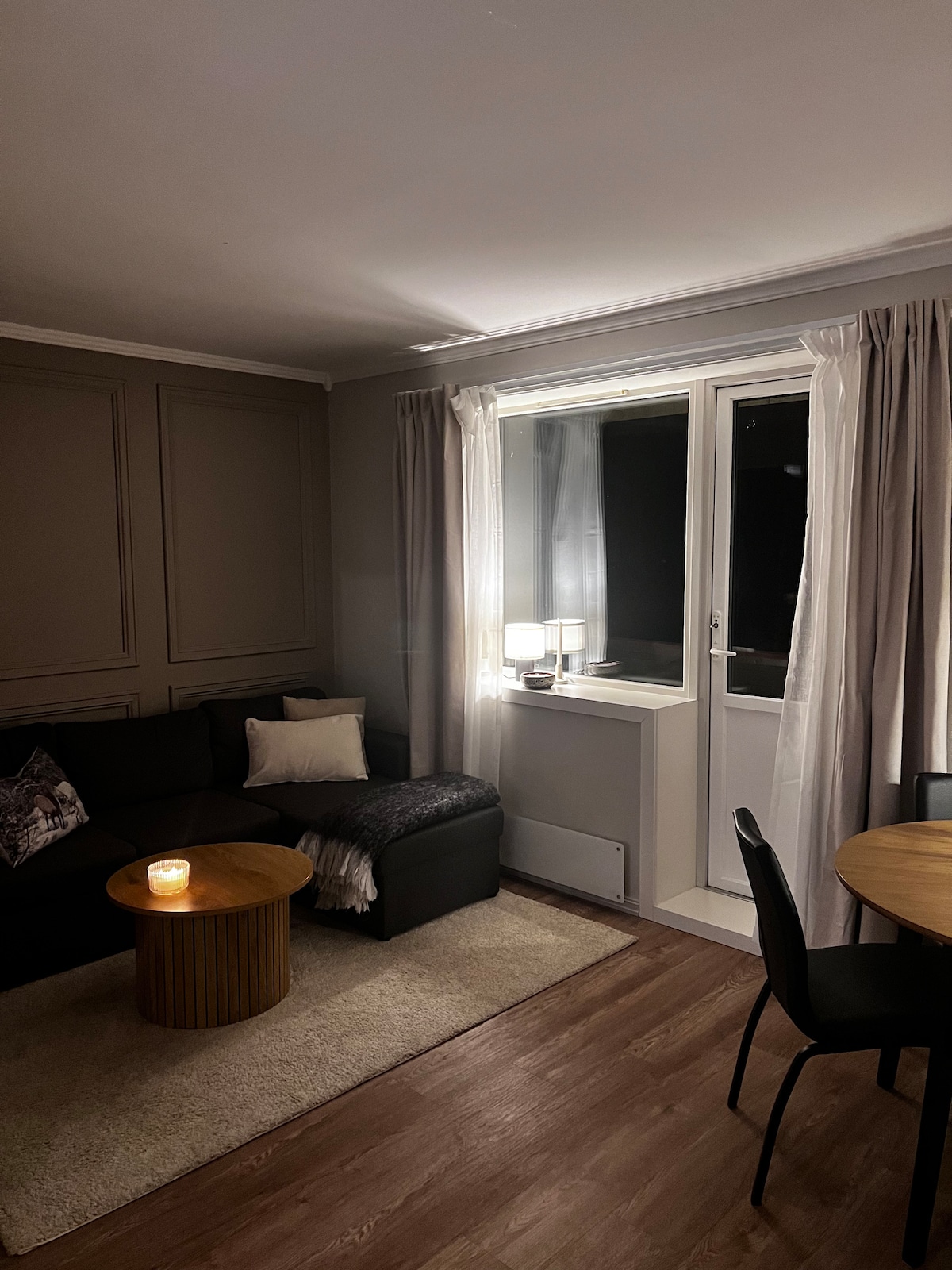 Koselig leilighet med egen parkeringsplass, internett og egen inngang. Varme i alle gulv. Stue med peis og chromecast. Soverommet har god plass, gode oppbevaringsmuligheter og egen kontordel. 1 seng 150 cm og 1 seng 120 cm samt en stol som kan gjøres om til seng på 80 cm. Kjøkkenet er godt utstyrt med kjøl/frys, hybelkomfyr, mikrobølgeovn og ellers alt man trenger.