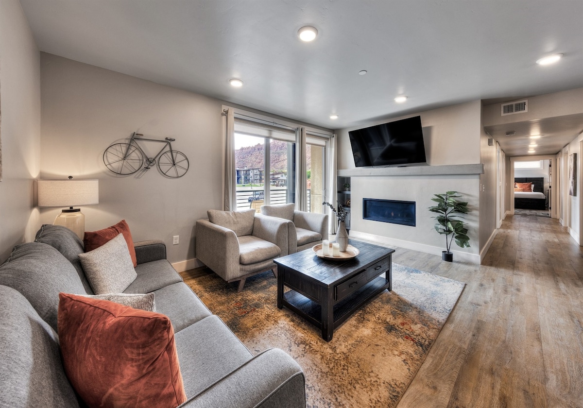 Enjoy Moab-3 bdrm Villa-NO CHORES!! Sleeps 8, 3 bedrooms, 4 beds, 2 ½ bathrooms. Fans of TLC’s hit show, Sister Wives, unite! Owned by Sister Wives star, Christine Brown-Woolley and her husband, David, you can enjoy this beautiful and peaceful townhome in Moab, Utah! Peruse the collection of news articles, magazine articles and family photos. This villa boasts beautiful rim views and starry skies, complete with a two-car garage, seasonal community pool, and high-speed Wi-Fi.