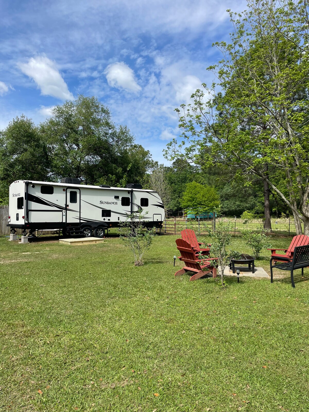Our 27’ foot Heartland Sundance camper is set up for guests on a small lot at the front of our farm property. Guests will have a great view of our pastures with our small herd of cows and horses. This area is set up for a glamping experience. This includes a fire pit, chairs and outdoor grill. The camper has 1 master bedroom, 2 twin bunk beds, the table and couch convert to beds as well. This camper is 1 of 2 campers now available on our farm.