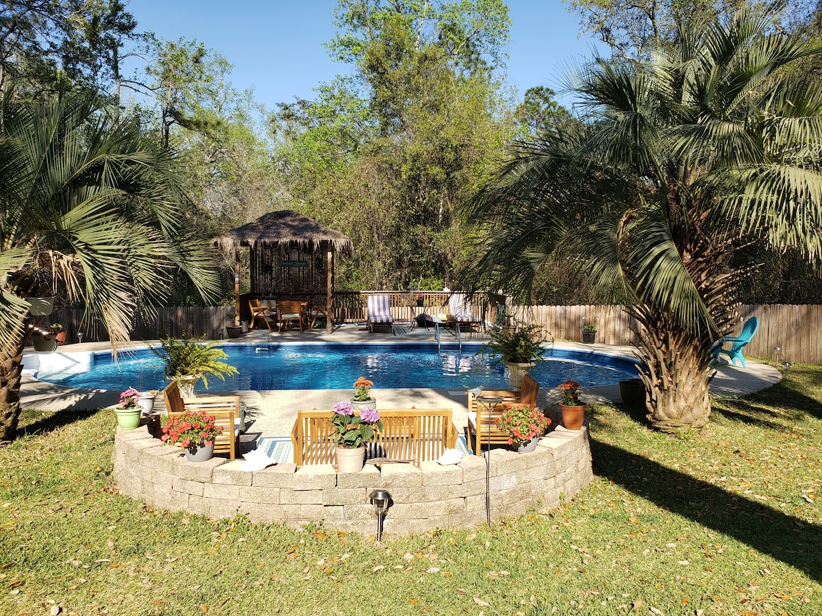 5 Miles from 2 I-10 ramps, 25 mins to NAS, 30 mins to 2 different beaches - Pens Bch & Perdido Key, 3 miles to equestrian, 4 miles from NFCU. We have a private entrance, walk-out basement. There are other bedrooms if necessary; however, those would be in our living space & more $$. We can accommodate up to 6 guests. During warmer months, pool and tiki are beautiful, another open patio and outside cooking - grill. Area inside has microwave, coffee pot, refrigerator, toaster oven, 52" t.v.