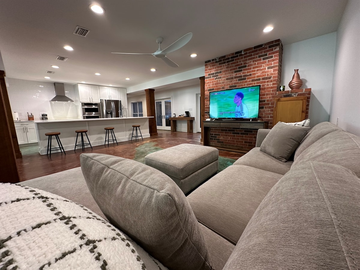This perfect gathering place is here! Cozy up to the fireplace in this charming luxury home, located in prestigious Lake Forest Estates. Home is completely remodeled and has 3 bedrooms and a Game room with 2 King sized Leather sleeper sofas that can accommodates 12 guests, 3 full bathrooms and a large bonus room with home theatre, bar table, poker/game table. Outdoor patio deck has a BBQ grill, table and fire-pit to gather around. - 10 min. away to Downtown Mobile and 5 min. to I-10..