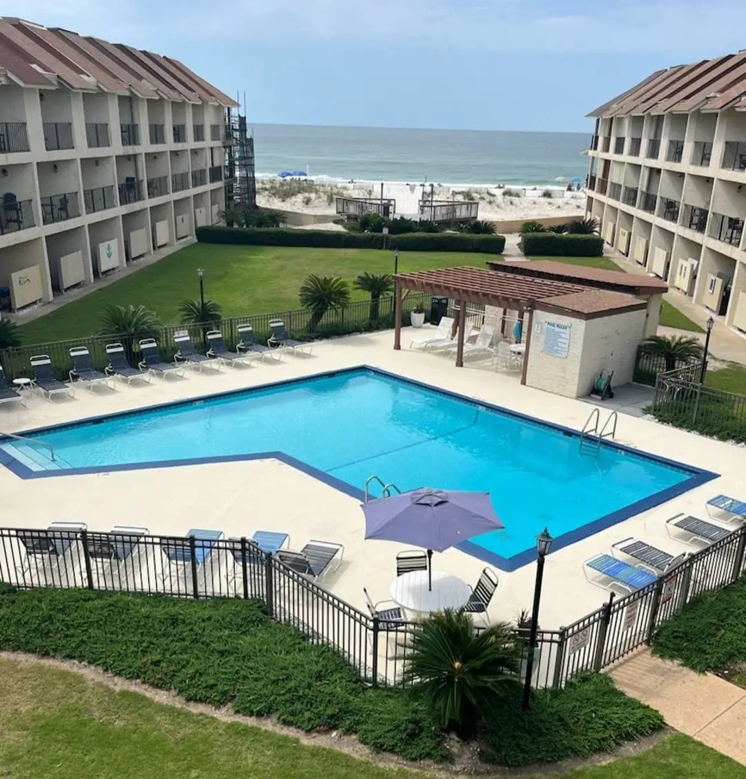Townhouse on the beach, 50 steps to the pool, and 50 more steps to the beach (no road crossing). Walking distance to the center of Gulf Shores. Lively beach decor, full kitchen, laundry, and two balconies to enjoy side views of the pool and beach. Balconies and windows face towards windowless wall providing privacy for our unit. Private carport attached to unit with direct access stairs. Two large bedrooms with en-suite baths. Additional full size inflatable bed, and inflatable tw